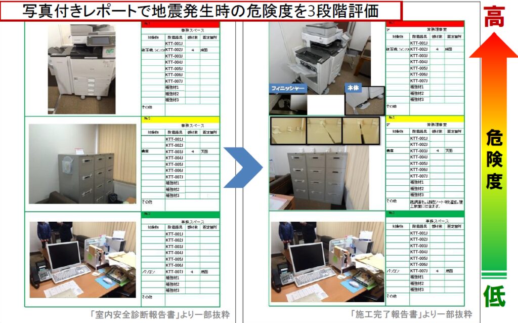 当協会より地震対策屋内診断士がオフィス内の家具や備品の危険度を評価し、必要に応じて適切な対策器具のご提案を行います。